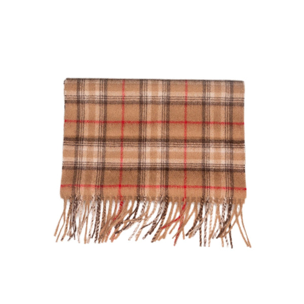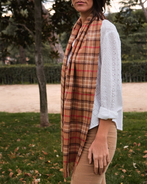 Bufanda en lana baby alpaca con diseño de cuadros escoceses y flecos en los extremos