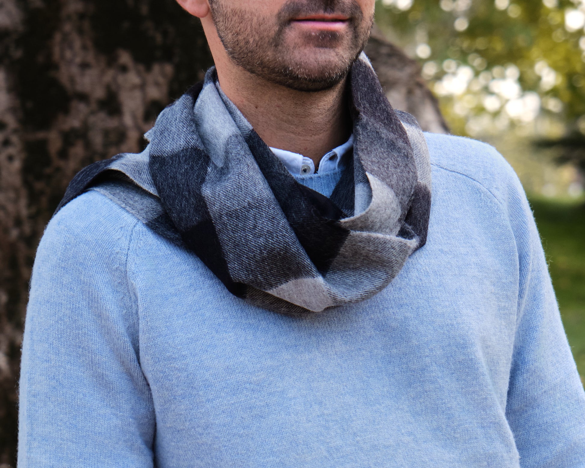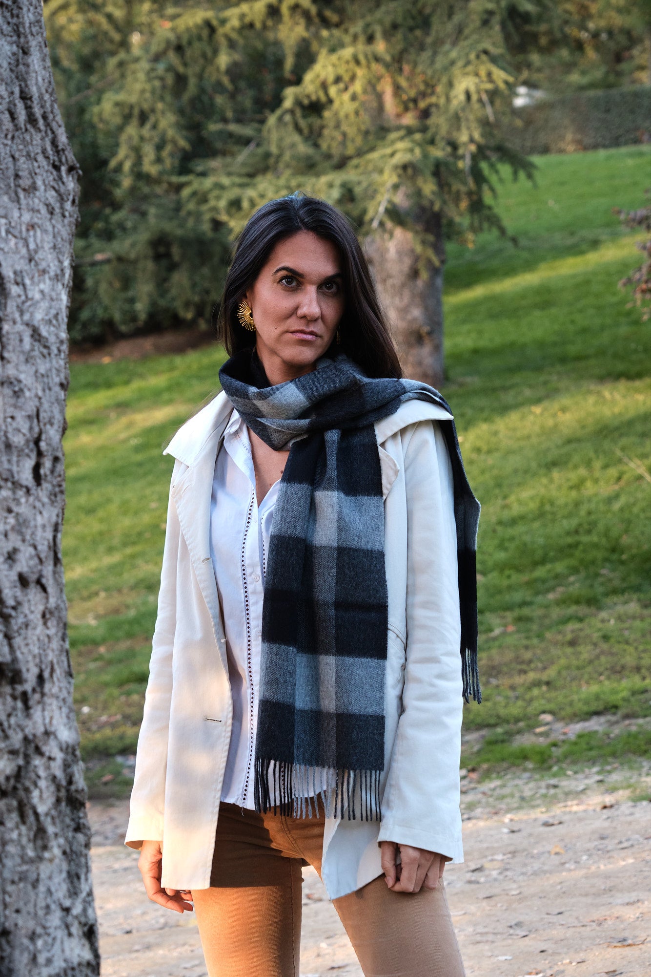Bufanda en lana baby alpaca con diseño de cuadros buffalo y flecos en los extremos